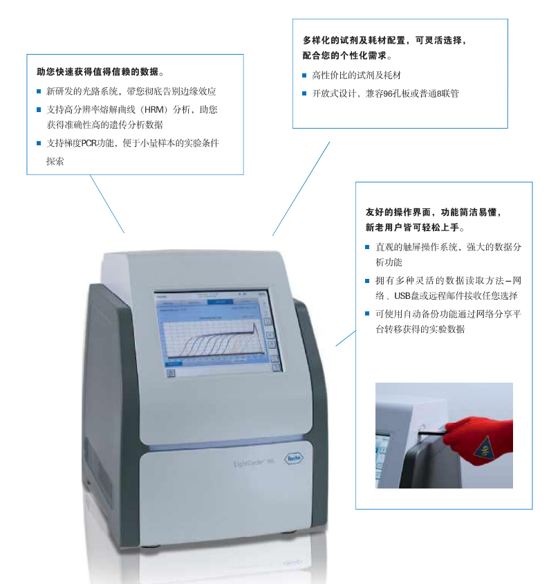 罗氏荧光定量PCR仪新研发的光路系统,融合当前前沿的设计技术,带您彻底告别边缘效应银质温控模块,带来速度与均一性兼得的实验结果,无需连接计算机,通过超大触控屏完成所有实验设计,分析软件功能强大,助您获得高质量的理想数据。
