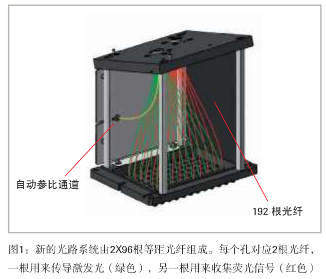 使用2×96根等距玻璃光纤,从96个孔中同时激发及捕获荧光信号